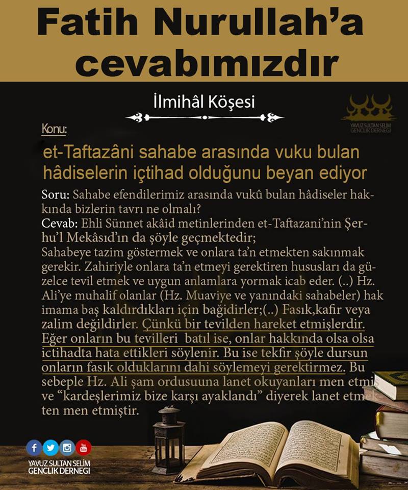 Uşşakî Şeyhi olduğunu iddia eden Fatih Nurullah isimli şahıs, kendilerine ait bir tv'de Hz. Muaviye'ye (ra) "Halife Hz. Ali'ye baş kaldırışı ictihadî değildir" diyerek hemde alay ederek fasık olduğunu iddia etmesi üzerine ve bu iddiasını asılsız isnad ile "et-Taftazâni'de içtihad değildir diyor" diyerek et-Taftazâni hz.ne dayandırmasına karşı et-Taftazâni'nin eserinden nakil yaparak cevab vermiştik. "et-Taftazani de tüm ehli sünnet ulâma gibi 'içtihad' diyor" demiştik. Fakat kendisi yine, yeni bir programda bizim paylaşımımızı ekrana getirerek "sizde 'baği' diyorsunuz bizde 'baği' diyoruz, söylediğimizin arasında fark yok" deyip paylaşımımızda yer alan et-Taftazâ'ni hazretlerinin beyanlarının devamını okumayarak konuyu saptırmıştır. Paylaşımımızda altı çizili olan satırlarda görüldüğü üzere söylediğimiz şey aynı değildir. et-Taftazâni'nin ve tüm ehli sünnet ulâmanın ittifâkı üzerine "Hz. Muaviye'nin baş kaldırışı içtihadî'dir fakat tabiki içtihâdında hata etmiştir. Bu önemli bir farktır. İçtihad değildi diyen şia'nın bir kısmı Hz.Muaviye ve yanındaki 10 bin sahabeyi fasıklıkla bir kısmı da kafirlikle itham etmektedir. Hâşâ..! Fatih Nurullah bey sözün nereye gittiğine dikkat etsin.